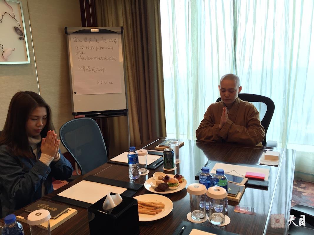 20151222果实法师在广州弘法期间,在广州香格里拉豪华阁会议室给信众讲《普贤菩萨行愿品》,继续给恩师圣观法师祈福!