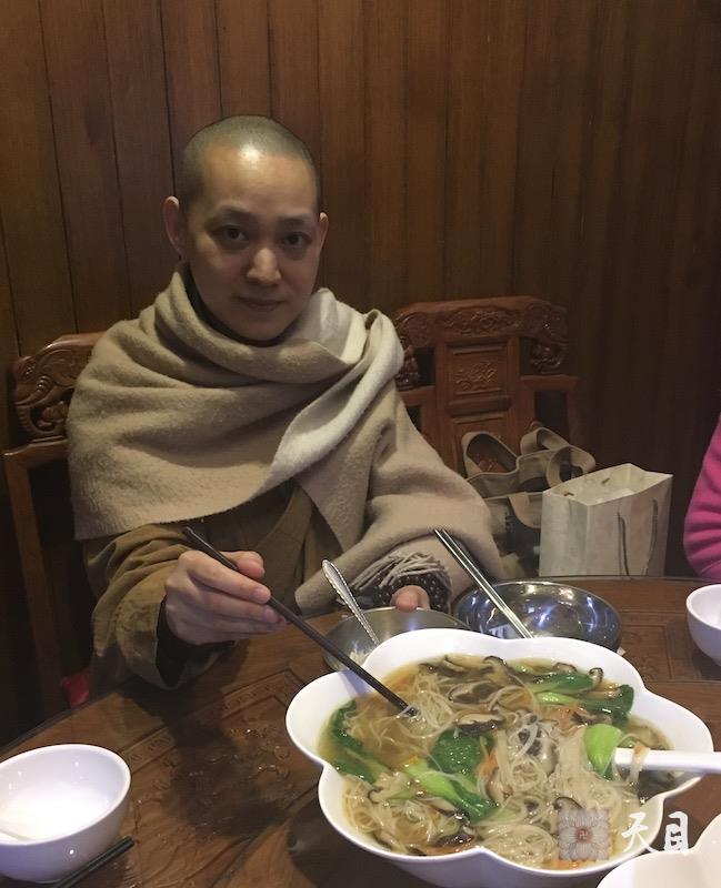 20151229果实法师在温州弘法期间,正值恩师圣观法师生日,应常珍居士供养常珍轩素食馆长寿面,给恩师圣观法师祈福!