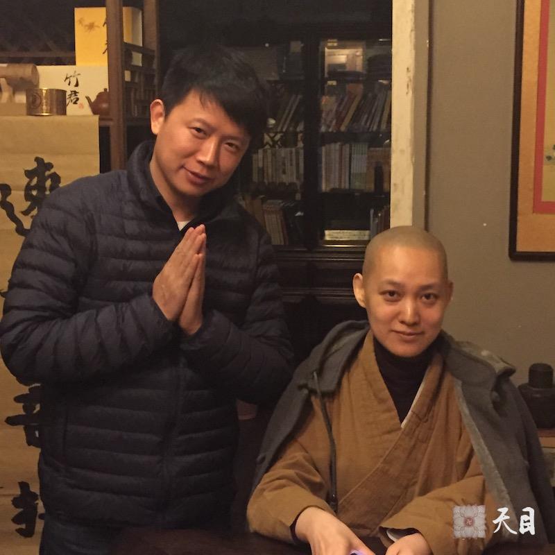 图为果实法师和常信居士在温州云开清净茶馆的合影。