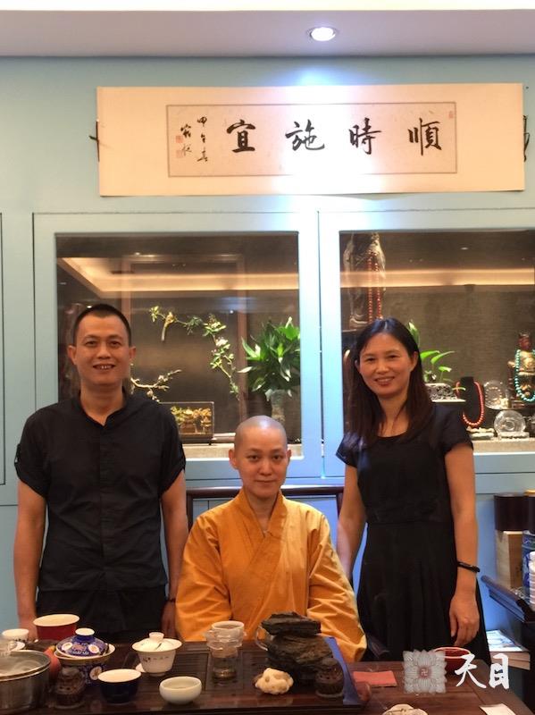 图为果实法师和常年居士阿梅夫妇、常贤居士在常年居士的海南沉香馆合影。