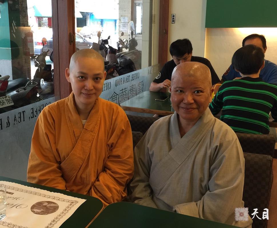 图为果实法师和心谦法师在桃园采枫素食馆、佛教弘誓学院的合影。