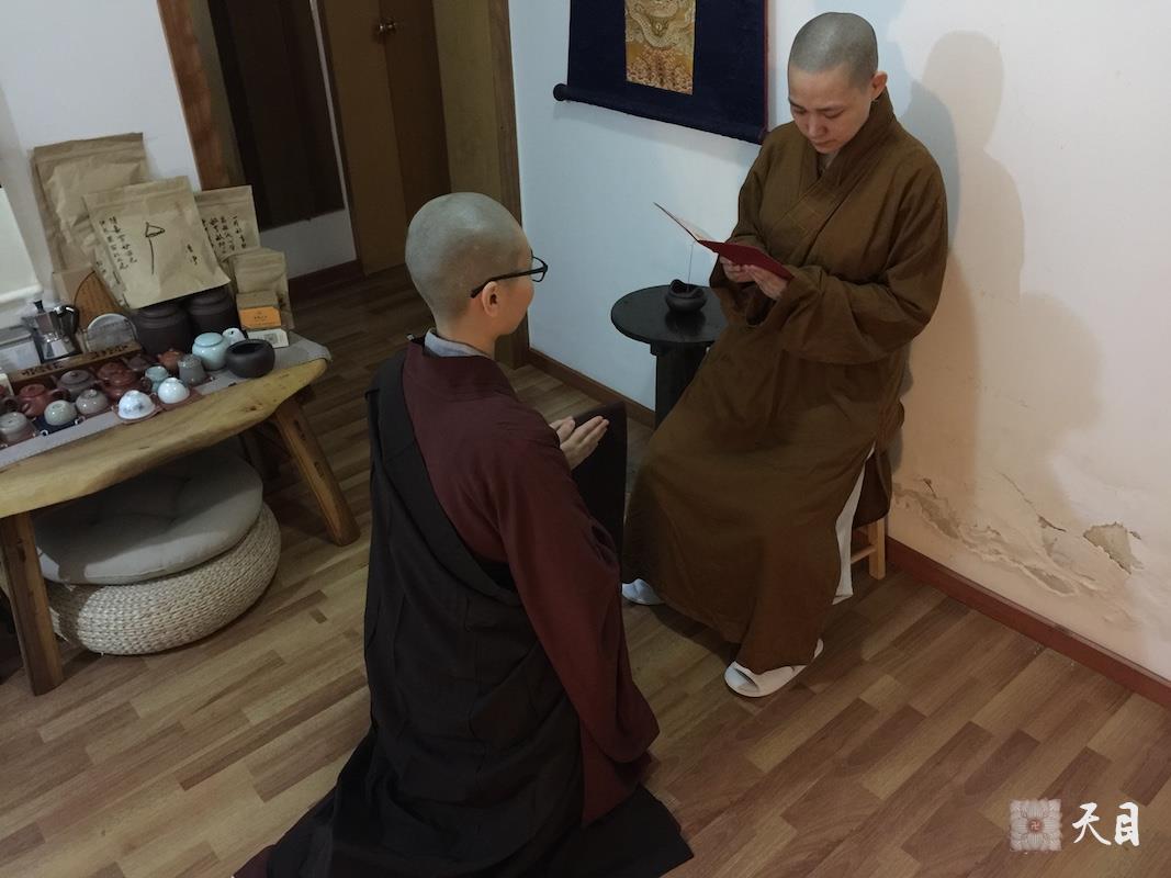 20161008果实法师在西安道场期间,刚刚受具足戒的常香法师专程从江西云居山前来西安佛堂亲近果实法师,向果实法师展大具,顶礼,以谢师恩。