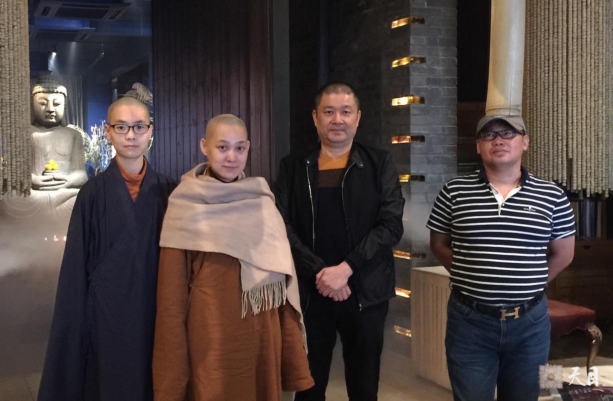 图为果实法师和常香法师、心一居士、傅海律师在北京净心莲素食馆的合影。