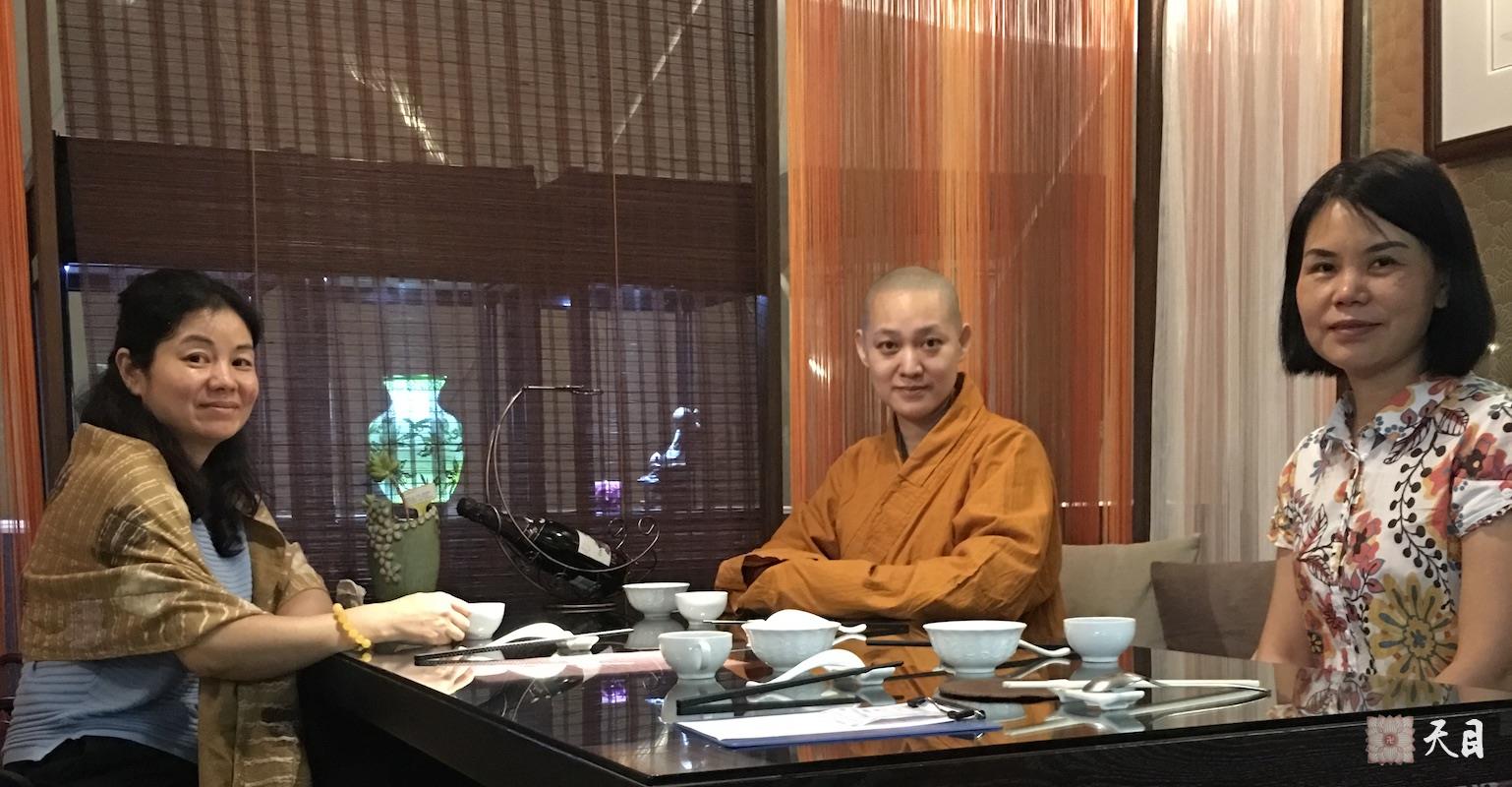 图为果实法师和果静居士、常彩居士在广州滴水坊素食馆的合影。