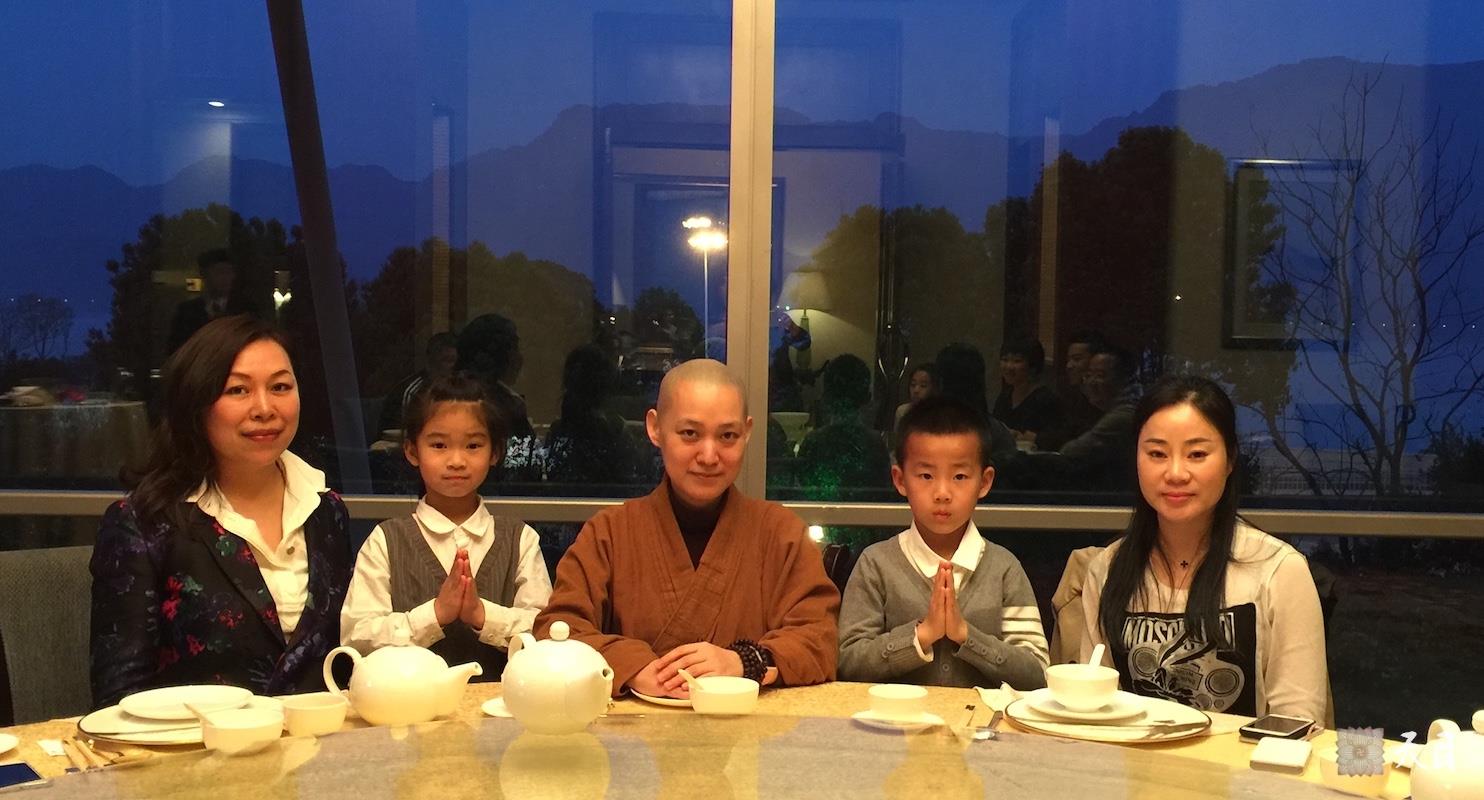 图为果实法师饭席间与果然居士、常意居士、常江居士、常帅居士在温州香格里拉香宫的合影。