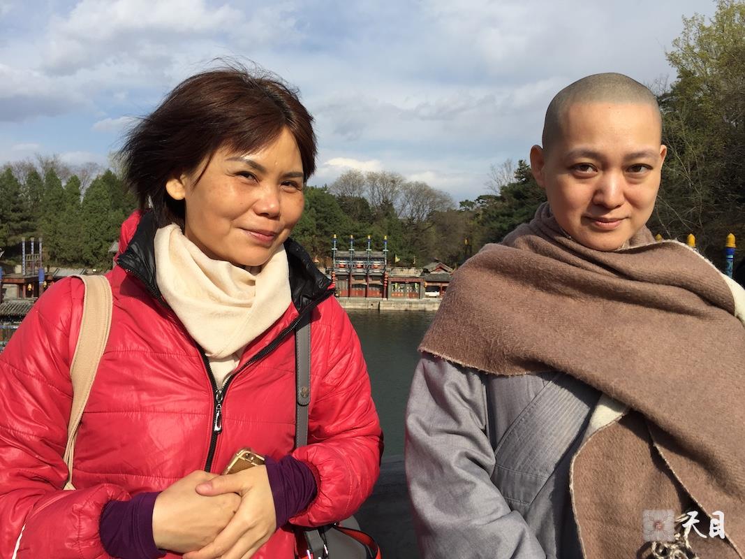 图为果实法师在北京颐和园苏州河三孔长桥上和常彩居士的合影。