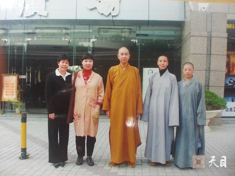 2005年11月,恩师圣观法师和弟子果慧法师、果愿法师、果阳居士、果园居士在深圳宝安南路登品素食馆门前合影。