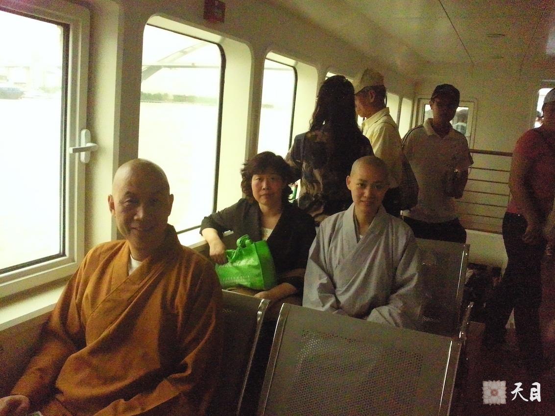 图为恩师圣观法师和果实法师、常阳居士在去往上海世博会的渡轮上。