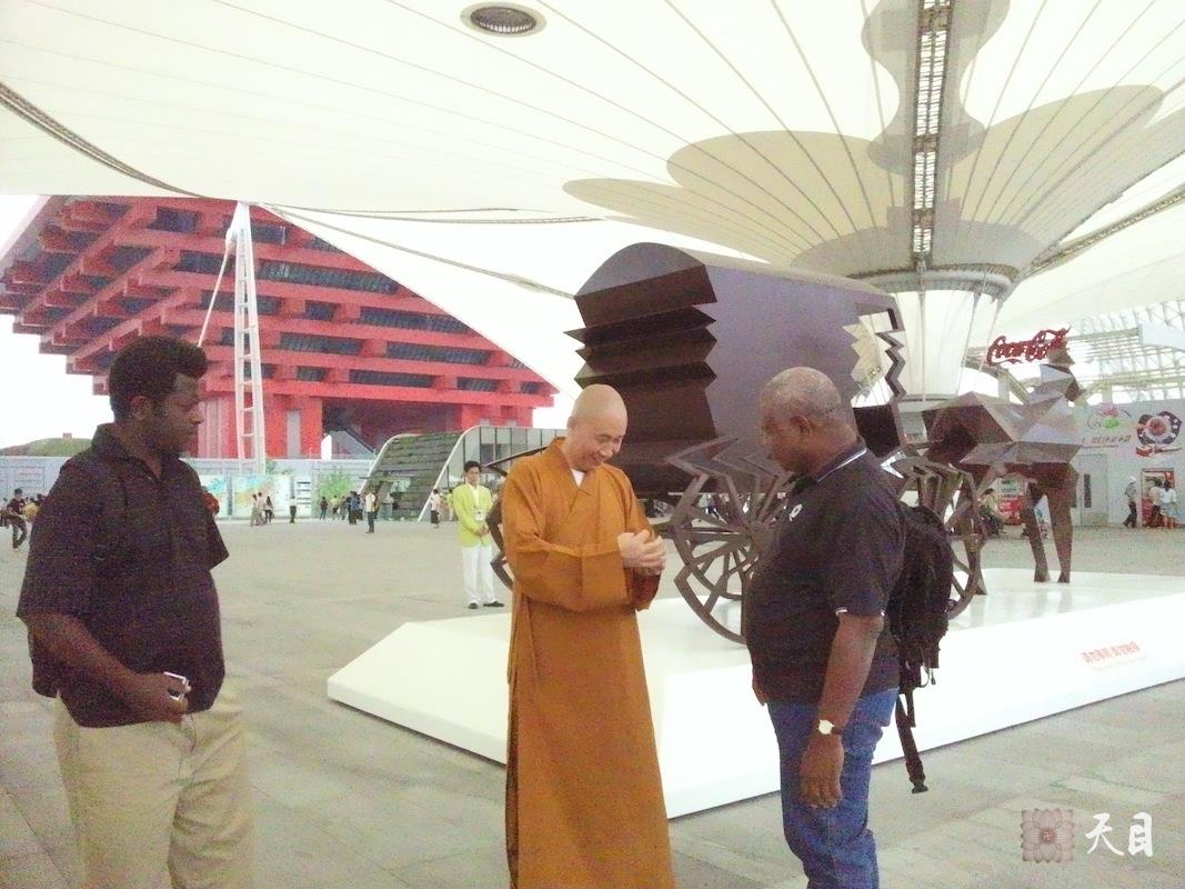 2010年5月26日,恩师圣观法师在上海弘法期间,带领果实法师游览上海世博会,常阳居士做护法。