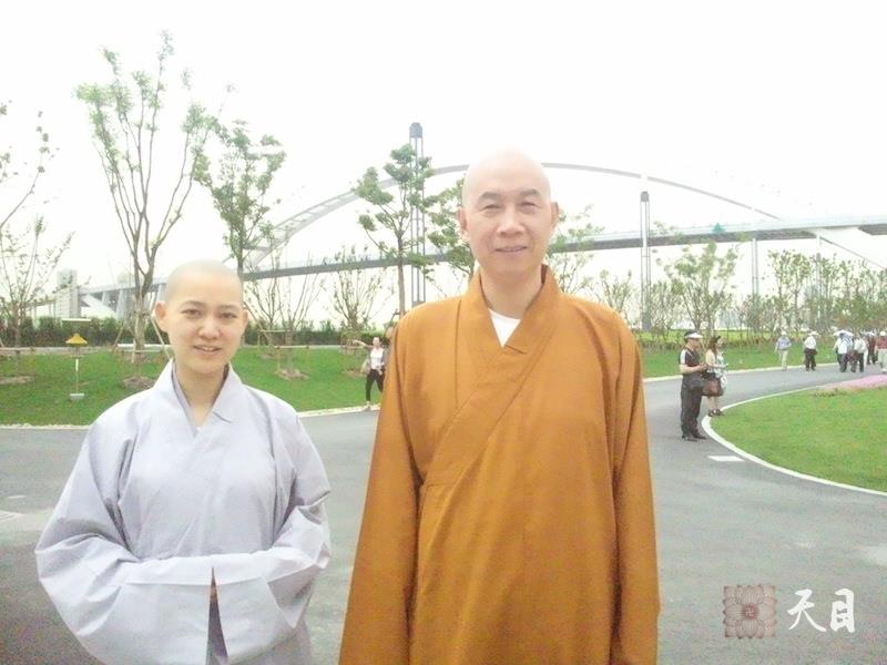 图一:恩师圣观法师在上海世博会进入会场和果实法师合影;