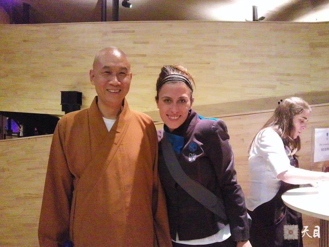 图三:恩师圣观法师和果实法师在上海世博会智利馆用树干做成装有扩音器的人脸独木雕像旁合影;