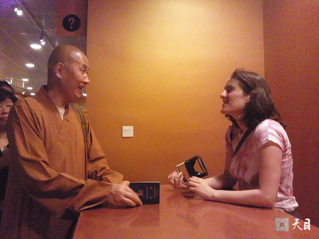 图为恩师圣观法师在上海世博会加拿大馆盖章时给加拿大工作人员讲佛法。