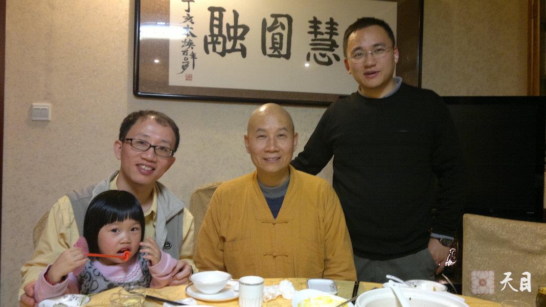 2011年11月21日,恩师圣观法师在北京弘法期间,应郭宇宽记者的供养在北京福慧慈缘(锡拉胡同)素食馆吃饭,给一同前来的胡佳父女开示,与他们合影。
